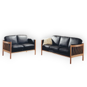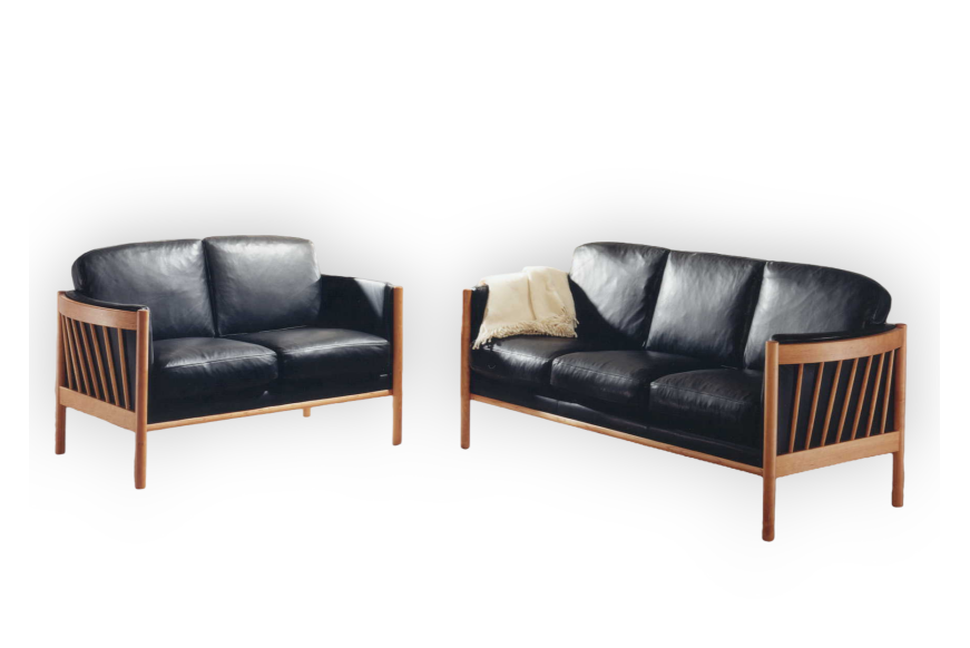 På billedet ses et 3 + 2 prs. Julie sofasæt, med sort læder, og bøge lak stel.