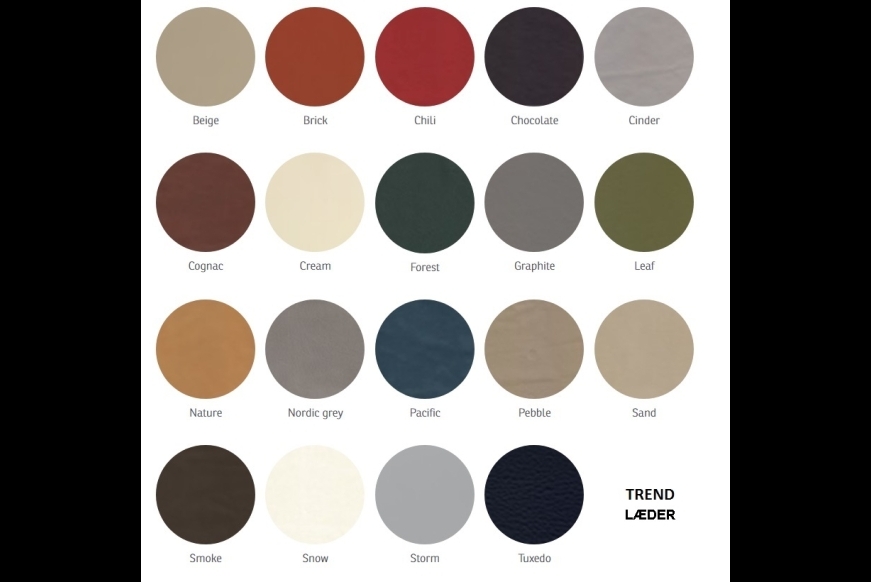 Trend er en gennemfarvet naturlig læder, og med dette betræk kommer der læder på alle flader. En blødere og mere smidig læder i høj kvalitet, som bevarer sit naturlige udtryk. Hvilket betyder, at der kan forekomme mindre urenheder mm. i selve læderen. Semianilinlæderet har fået en beskyttende behandling, som gør det meget nemt at holde.