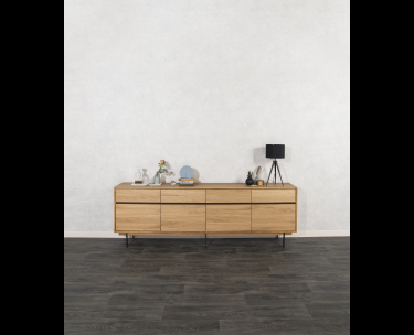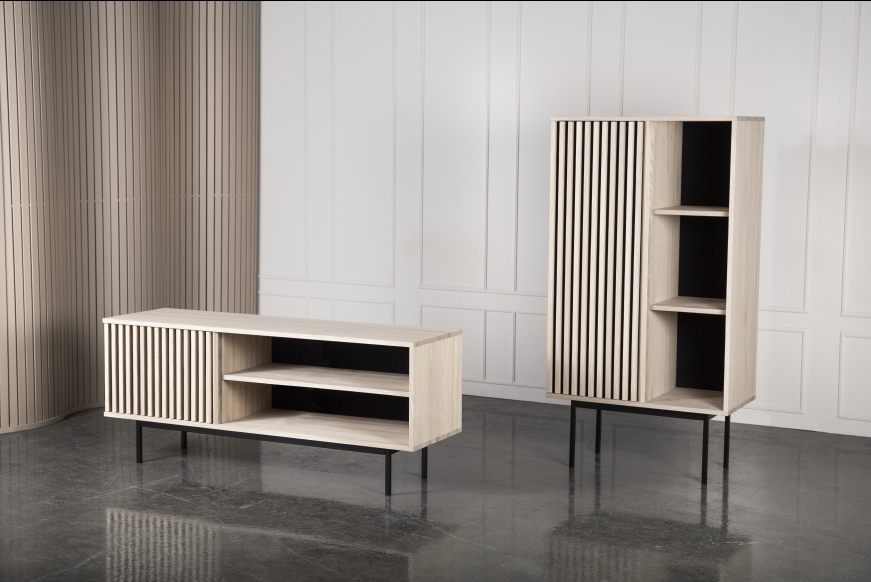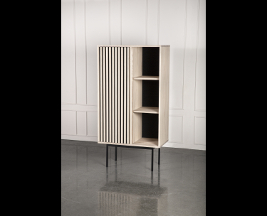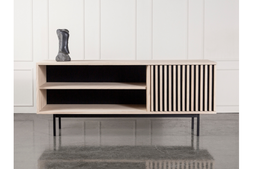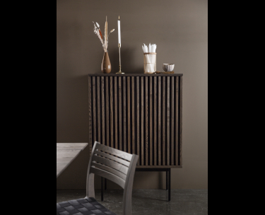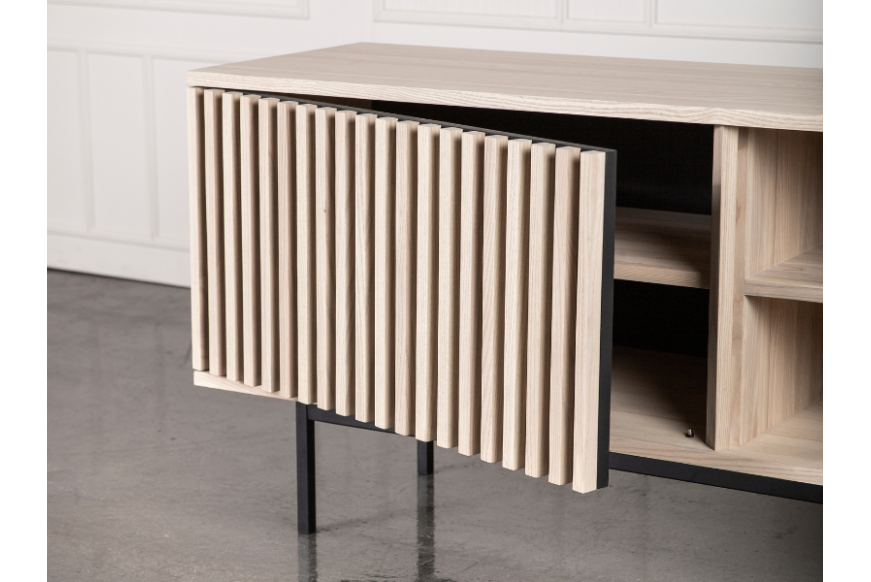 AKUSTIK SKÆNK fra Kristensen & Kristensen er designet med ønske om at forbedre akustikken i boligen samt opretholde et pænt udtryk. Kombinationen af trælameller og filt, er ikke blot tænkt ind i designet for at fornøje øjet, men i lige så høj grad for at absorbere rumklang. Skænken er vist her i massiv hvidolieret ask med sort metal sokkel.